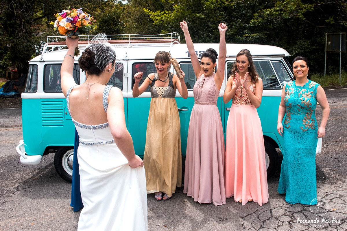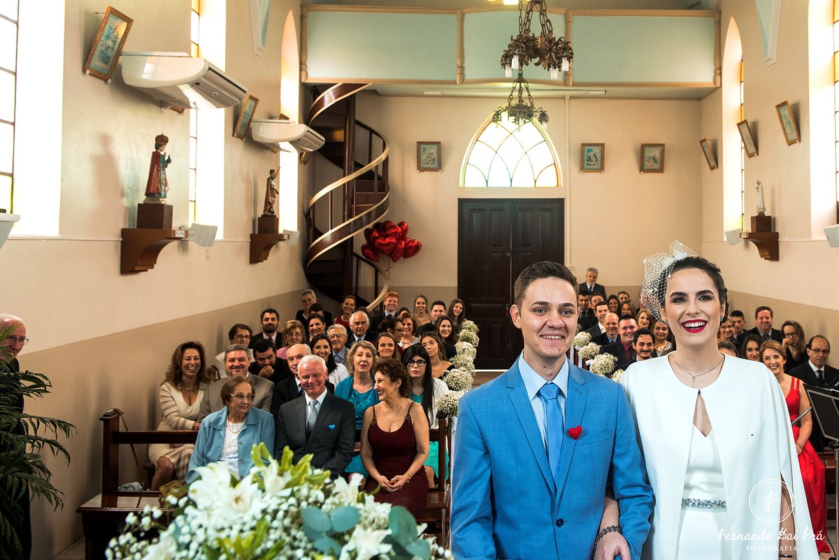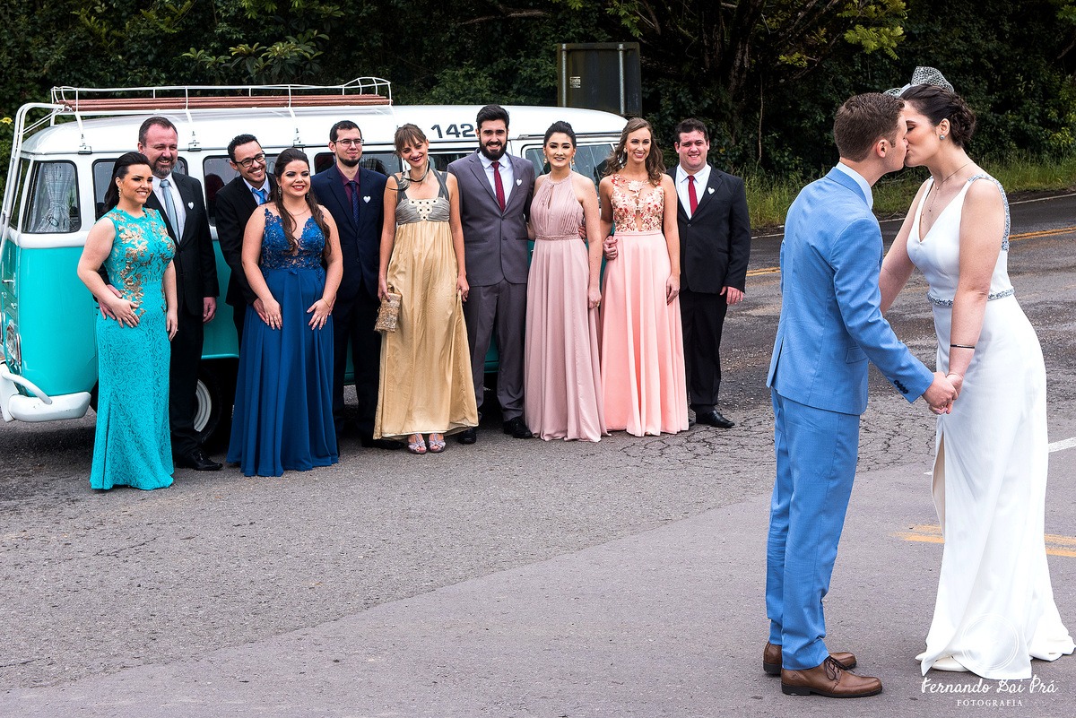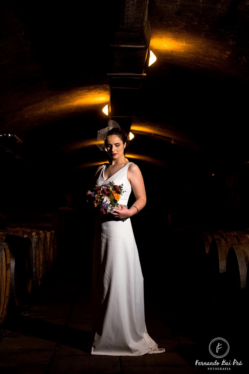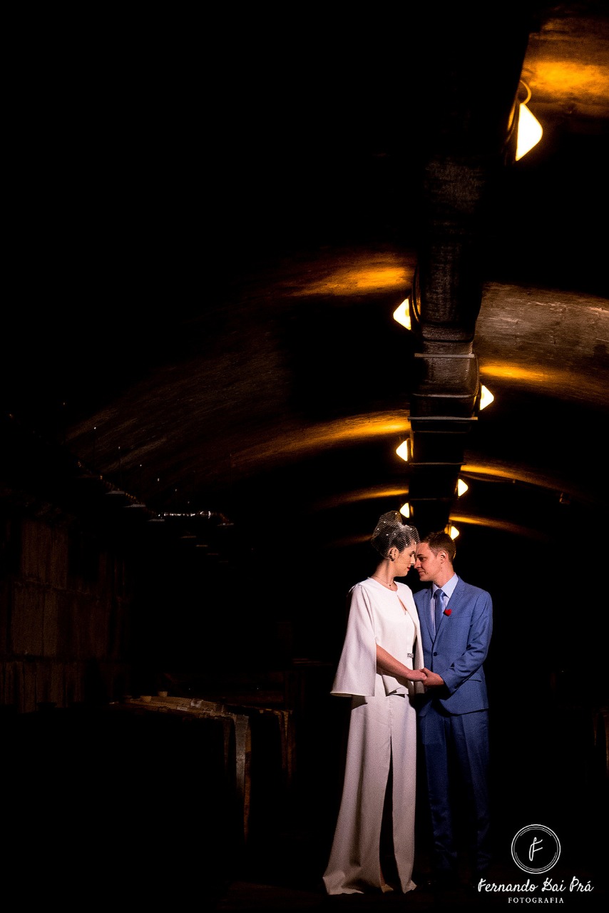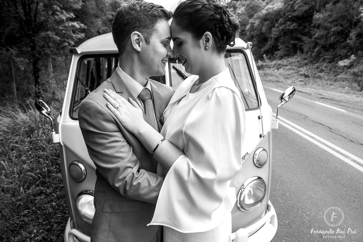 “Gostei principalmente de ela ter respeitado meu gosto, inspirado em alfaiataria. Pude casar com um vestido autêntico, meu. Não o ‘da moda’. Mas o que eu quis”, diz a noiva, que casou-se com Marcelo Ferreira Lorenz, com quem havia namorado por nove anos. O casamento foi realizado durante a manhã, seguido de um almoço na Linha 80, em Flores da Cunha.