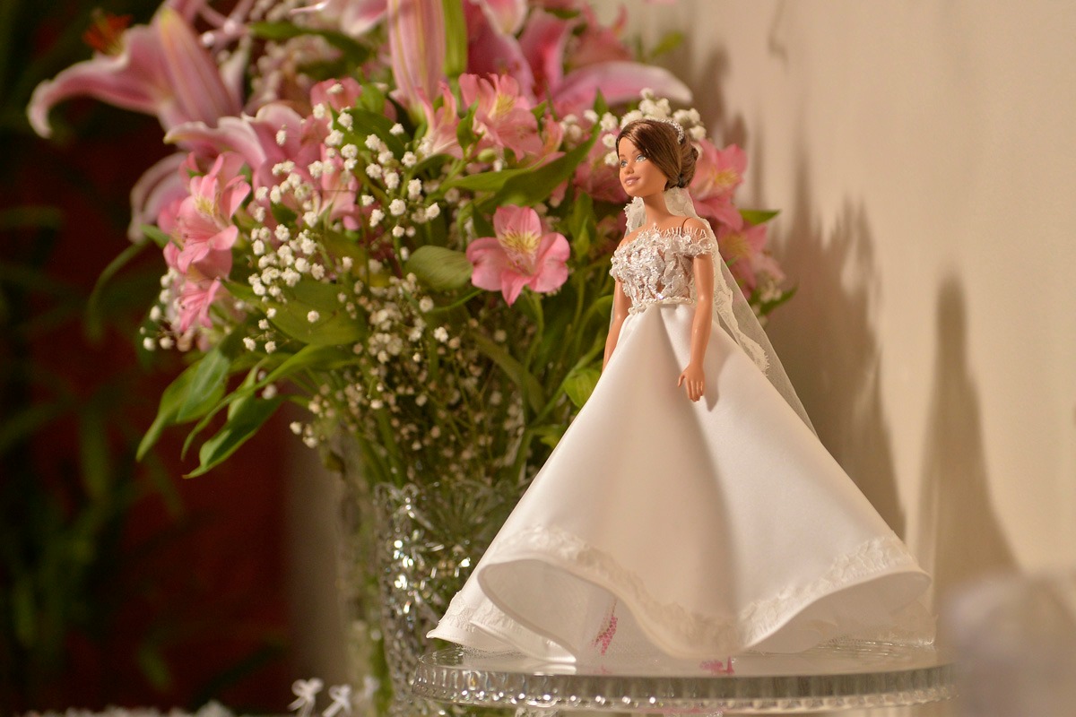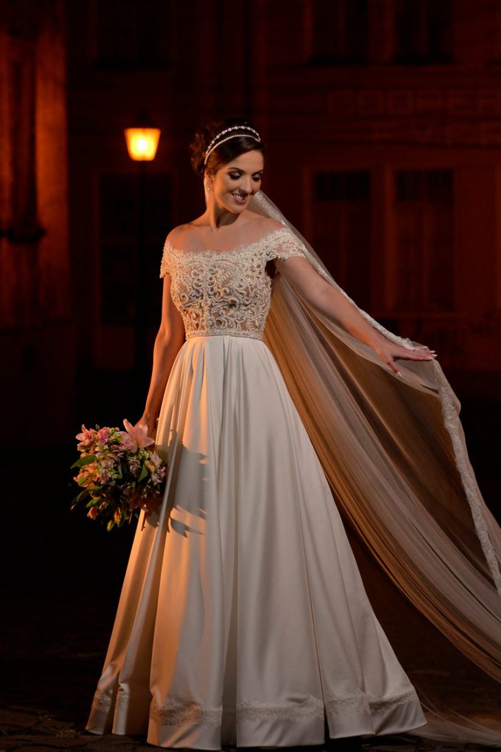 Para a cerimônia, em junho de 2017, Michele quis um vestido off white, ombro a ombro, rendado, com transparência e saia lisa e armada. “A Ana foi me ajudando a construir uma ideia que eu já tinha, e várias coisas do vestido foram ideias dela. Eu apresentei a ela o que queria, um vestido ombro a ombro, e ela me ajudou a definir todos os detalhes”, explica a noiva.