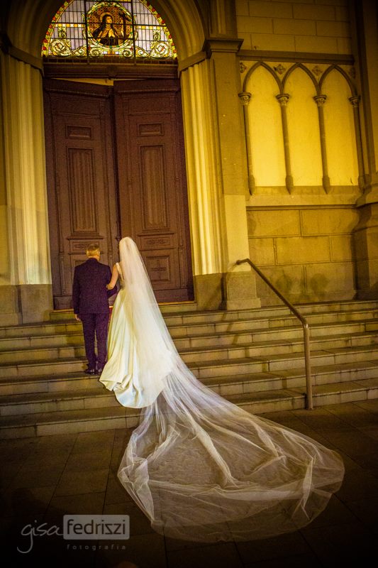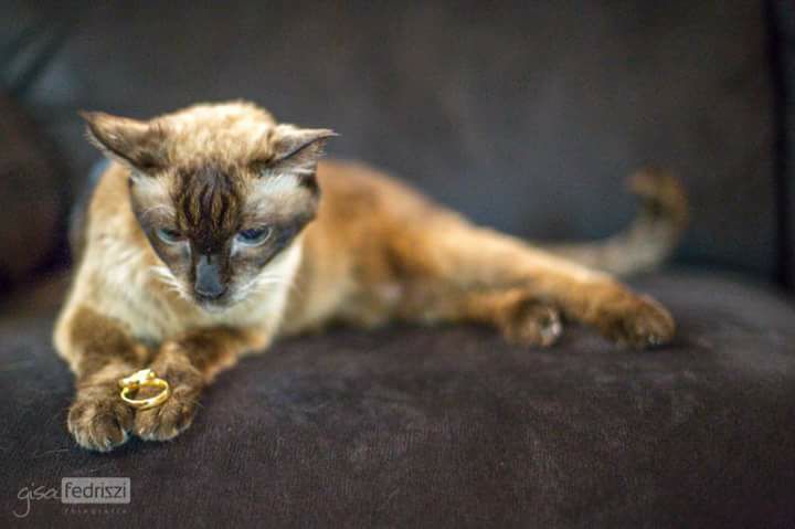 Nossa valsa não poderia ser diferente, estilo vienense para The Emperor Waltz”, relembra a noiva. Até a gatinha de estimação do casal participou da cerimônia. Cindy, que tem 19 anos de idade, segurou as alianças. “Eu não teria como deixar ela de fora, ela faz parte da nossa vida.”