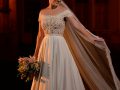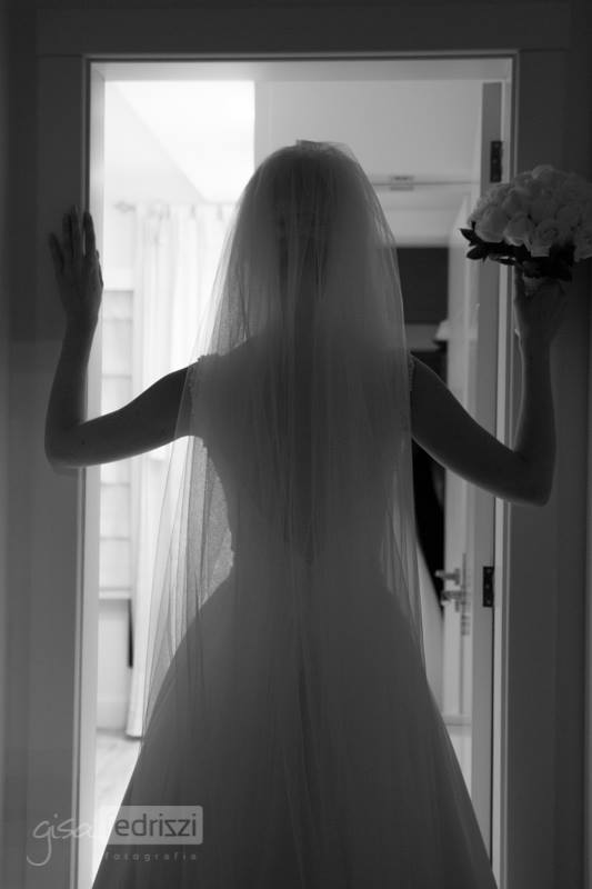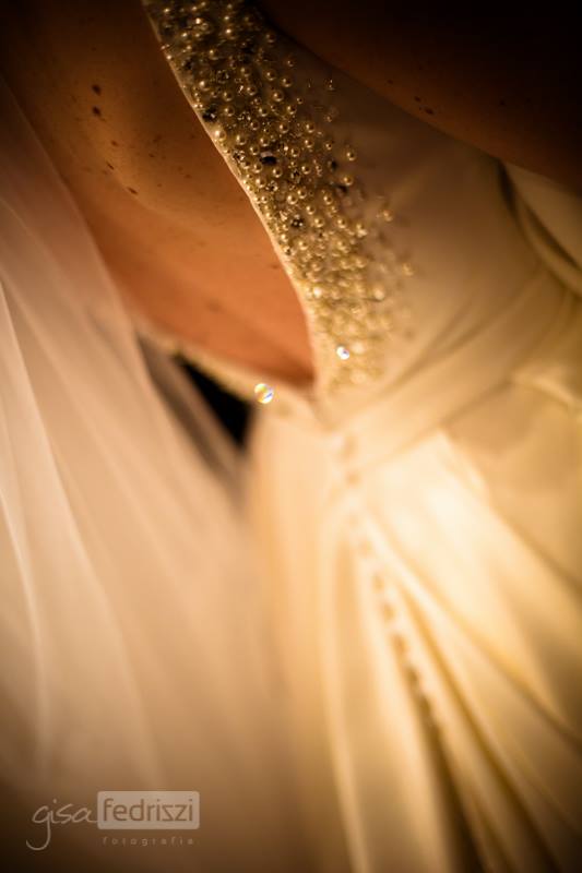 Assim como o restante do casamento a noiva quis um vestido clássico, sem rendas ou bordados. “Eu tinha em mente um modelo e a Ana colocou ele no papel. Eu pedi uma saia armada e removível, alça levemente caída trabalhada com cristais e pérola, apenas. Costas de fora. Cauda e véu longos (o véu tinha 5 metros). A saia de baixo era sereia com um laço de tule armado na parte de trás da cintura. Perfeito. Meu vestido dos sonhos. Um vestido de princesa. Só tenho a agradecer a Ana e toda a equipe pela dedicação em poder realizar nosso sonho de princesa por um dia.”