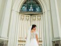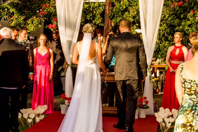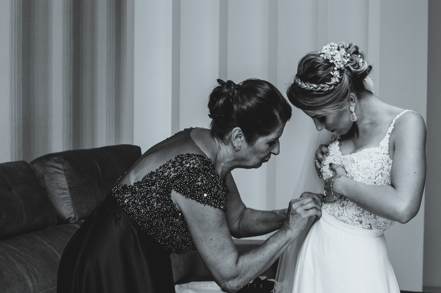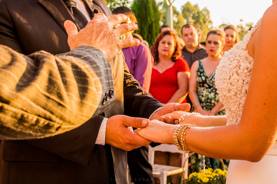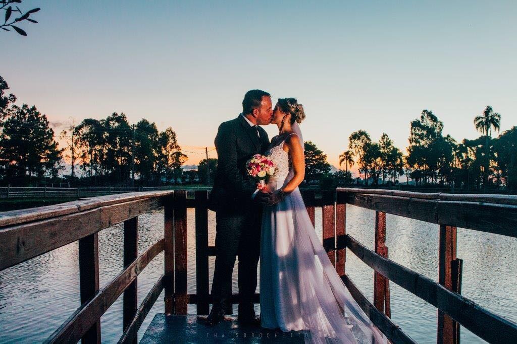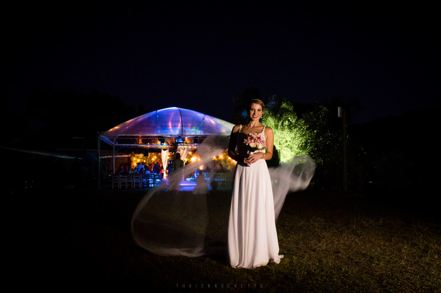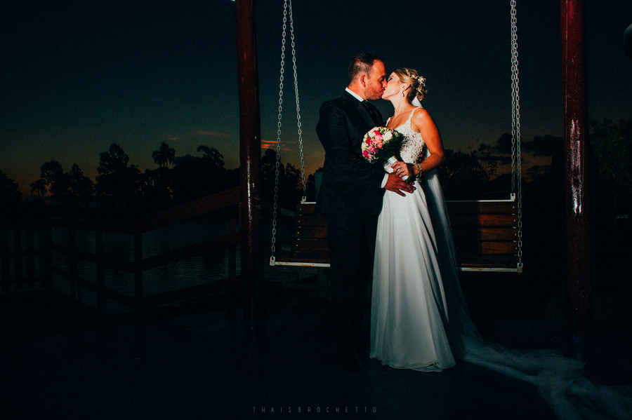 O vestido Ana Dotto que a noiva Greici Santini escolheu era de um tecido leve, para que ela conseguisse transitar com facilidade pelo salão de festas da Pousada Roni e Mary, em Criúva, interior de Caxias do Sul. “Nas lojas de aluguel, eu provava vestidos e me sentia um robô. Não conseguia nem caminhar. Não era isso o que eu queria. Procurei a Ana e acertei. Ela fez uma saia longa bem levinha. Só tinha uma cauda porque eu não abri mão”.