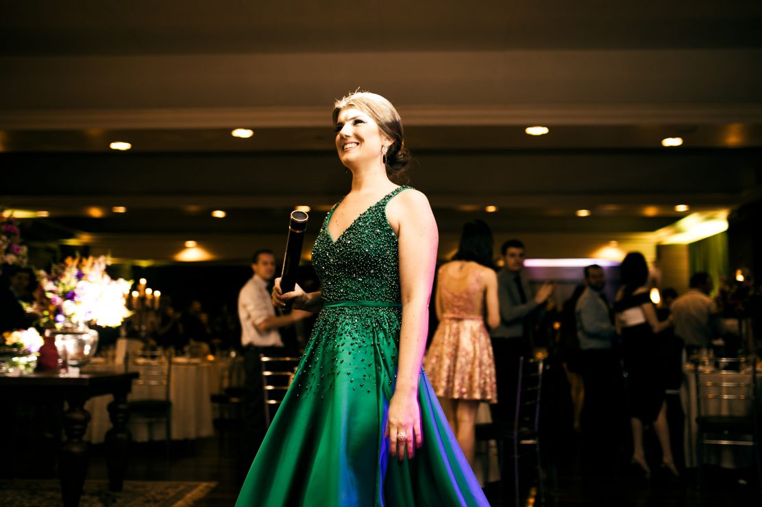 Para a graduação em Arquitetura e Urbanismo, Bárbara Haas escolheu um vestido Ana Dotto cor verde-bandeira. “Eu queria uma cor bem ousada porque gosto de coisas diferentes. E ficou bonito, combinou com meu tom de pele e cor dos olhos. Usei uma sandália rosa pink e o contraste ficou bem bacana. Combinou bastante com a decoração que era bem colorida, com cores vivas, alegres”, conta a formanda.
