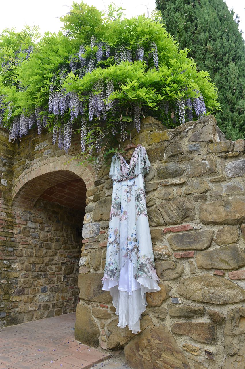 O noivo não sabia, mas o vestido traria uma seda da região da Toscana, Itália, onde a festa seria realizada. Méri escolheu uma peça estampada, leve e esvoaçante para combinar com o ambiente primaveril da Casa Cornacchi. O vestido tinha ainda babado, decote e uma fenda na frente. “Até véu eu usei”, destaca.
