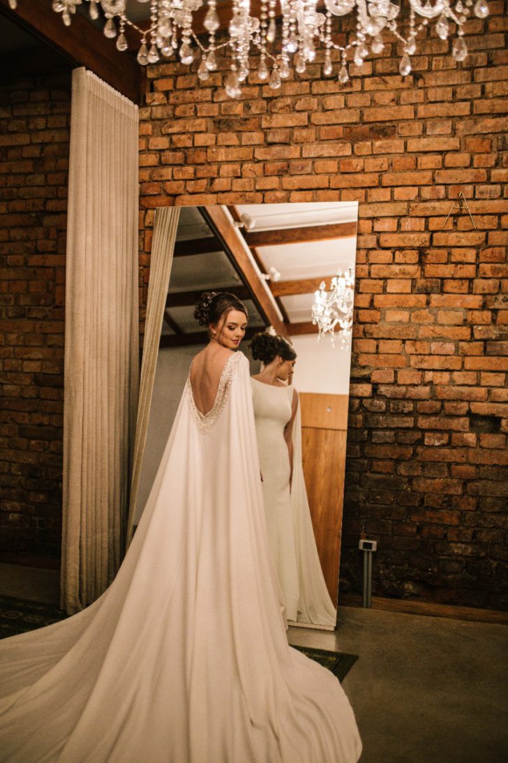 O croqui foi desenhado cerca de dez meses antes do casamento. Mas o processo de confecção foi rápido. A primeira prova foi em fevereiro de 2019 e o casamento de Carolline e Marcelo Sartori Gazzola foi no dia 25 de maio do mesmo ano, em uma cerimônia no Altos do Vale. “Peguei o vestido na véspera, geralmente ela entrega uma semana antes, mas a capa era tão pesada que não podia deixar na caixa porque iria amassar, nem pendurado, pois podia rasgar. Ela me deixou sempre muito tranquila, foi sensacional.”