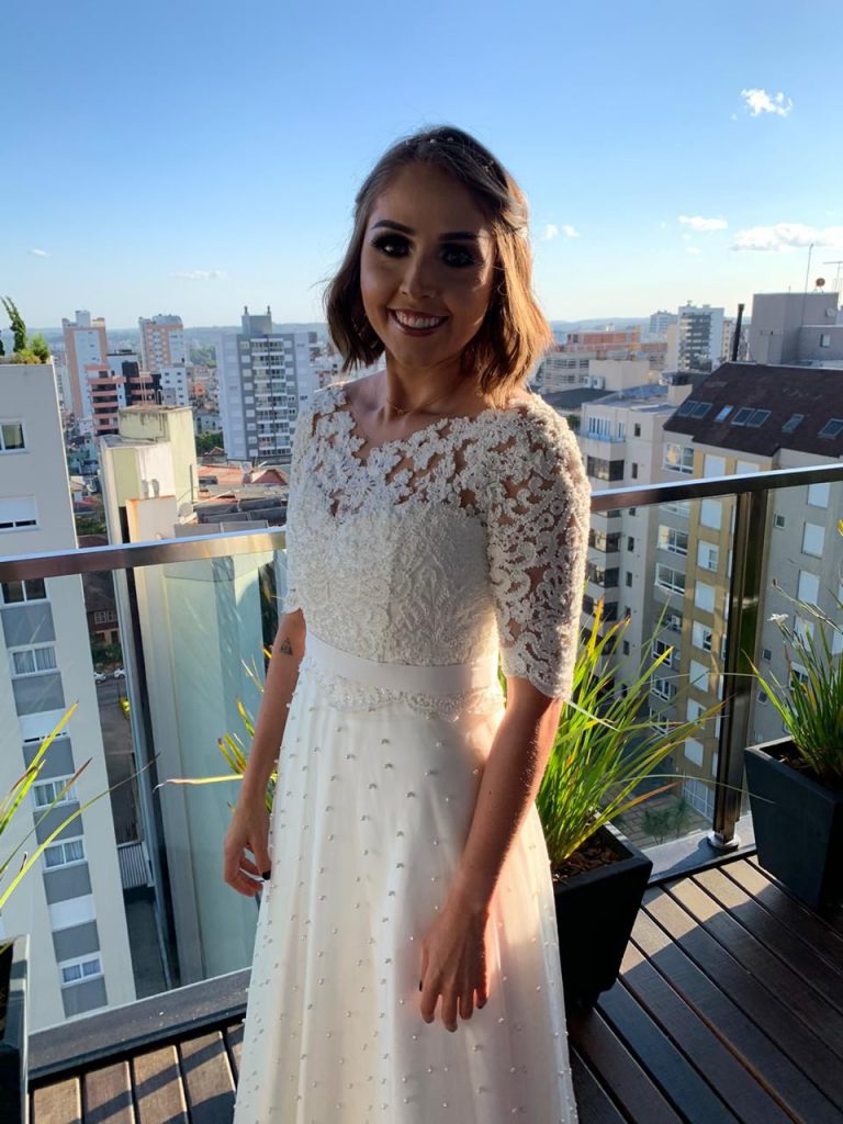Assim como a cerimônia e festa (com valsa ao som de violino e piano) foram muito personalizadas, o vestido seguiu o mesmo caminho. Nicole, que é arquiteta, já conhecia a Ana Dotto da época de faculdade no Campus 8, onde também é a sede do curso de Moda da UCS. E quando ficou noiva, decidiu procurá-la.