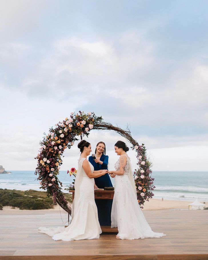 Os atendimentos das noivas foram separados: elas não queriam ver o vestido uma da outra antes do grande dia. Foi só quando chegaram no altar que viveram esse momento.
